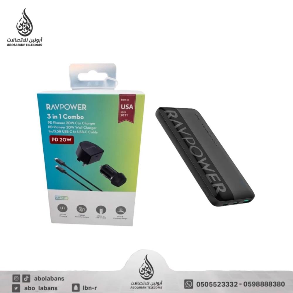 عرض راف باور الامريكية : بور بانك بقوة 20w وبثلاث منافذ منفذين PD ومنفذ USB وراس شاحن منزلي وشاحن سيارة بقوة 20W وكيبل تايب سي كل المنتجات تدعم الشحن الآمن والسريع